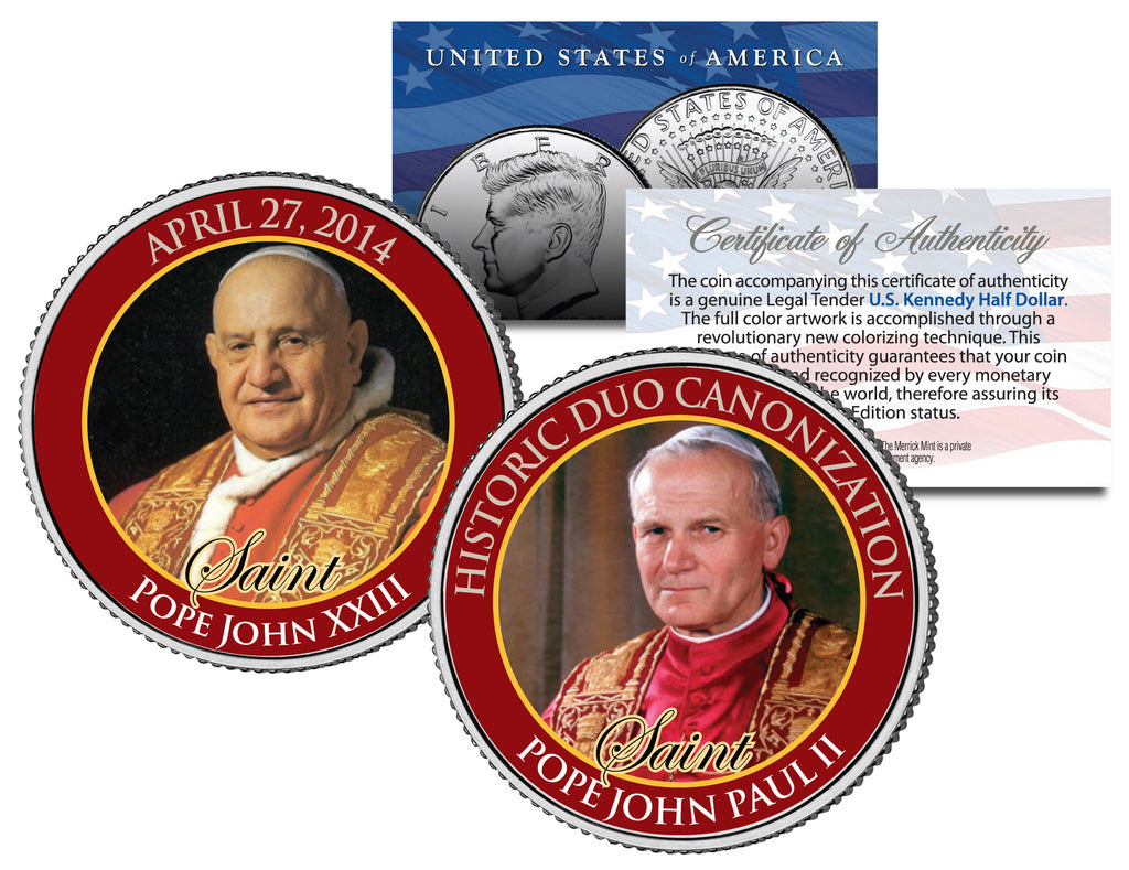 Popes John XXIII and John Paul II were declared saints on April 27, 2014, the first-ever double papal canonization. Here is your opportunity to own or to gift the “HISTORIC DUO CANONIZATION – APRIL 27, 2014 – POPE JOHN XXIII & POPE JOHN PAUL II – SAINTS” colorized 2014 JFK Kennedy Half Dollar U.S. Coin, which has been enhanced with a beautifully colorized images on both sides of the coin by the Merrick Mint. Each coin comes in a premium coin capsule with a full color Certificate of Authenticity. This Legal Tender United States coin has been colorized with an application of special inks directly to the surface of the coin, using a unique and painstakingly multicolor coin process, which achieves a level of detail, color saturation, and durability that is #1 in the coin industry. The result is an everlasting colorized coin collectible of ultra-high quality. The 2014 Kennedy half dollar is a U.S. fifty cent coin with coin mint marks chosen at random.