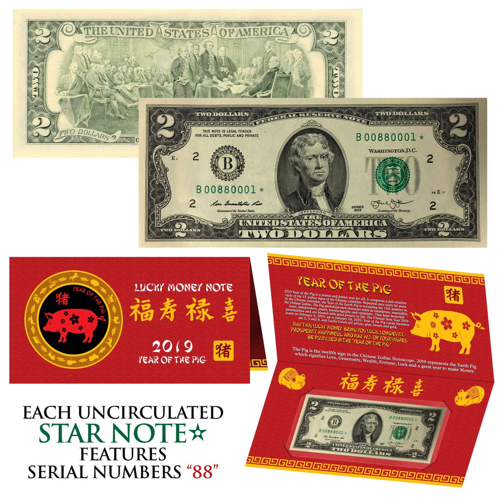 In celebration of the 2019 Year of the Pig Chinese Lunar New Year, wehave announced the newest addition to its Lucky Money Collection…2019 Year of the Pig Lucky 8’s Serial Number Banknotes. The Year of the Pig 2019 product is designed with Decorative Chinese Symbolism and packaged in a Symbolic Red Folder adorned in Full-Color. Each folder contains an uncirculated Genuine Legal Tender United States Banknote.
