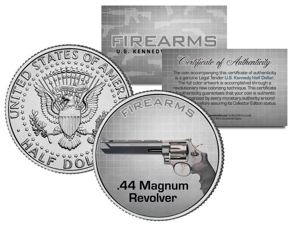 FIREARMS SERIES - .44 MAGNUM REVOLVER Gun. Here is your chance to own an OFFICIAL beautifully colorized JFK Kennedy Half Dollar U.S. Coin. This official high-quality genuine Legal Tender United States Coin has been colorized using a unique multicolor authentic process. Colorizing coins involves the unique application of special inks directly to the surface of a coin using a unique and painstakingly multicolor coin process that achieves a level of detail, color saturation, and durability that is #1 in the industry. The result is an everlasting colorized coin collectible of ultra-high quality. Each coin comes in a premium coin capsule with a Certificate of Authenticity.