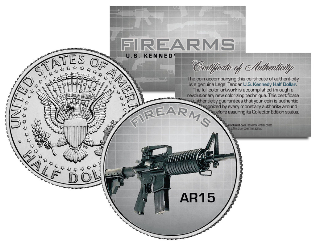 FIREARMS SERIES - AR15 Gun. Here is your chance to own an OFFICIAL beautifully colorized JFK Kennedy Half Dollar U.S. Coin. This official high-quality genuine Legal Tender United States Coin has been colorized using a unique multicolor authentic process. Colorizing coins involves the unique application of special inks directly to the surface of a coin using a unique and painstakingly multicolor coin process that achieves a level of detail, color saturation, and durability that is #1 in the industry. The result is an everlasting colorized coin collectible of ultra-high quality. Each coin comes in a premium coin capsule with a Certificate of Authenticity.