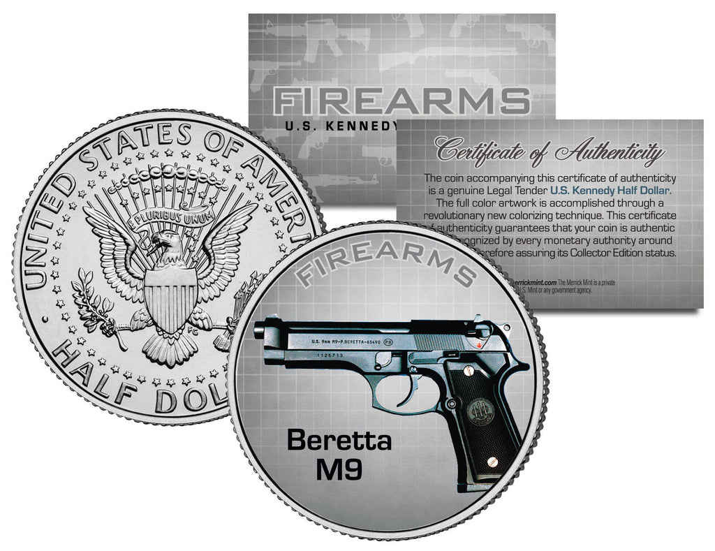 FIREARMS SERIES - BERETTA M9 Gun. Here is your chance to own an OFFICIAL beautifully colorized JFK Kennedy Half Dollar U.S. Coin. This official high-quality genuine Legal Tender United States Coin has been colorized using a unique multicolor authentic process. Colorizing coins involves the unique application of special inks directly to the surface of a coin using a unique and painstakingly multicolor coin process that achieves a level of detail, color saturation, and durability that is #1 in the industry. The result is an everlasting colorized coin collectible of ultra-high quality. Each coin comes in a premium coin capsule with a Certificate of Authenticity.