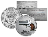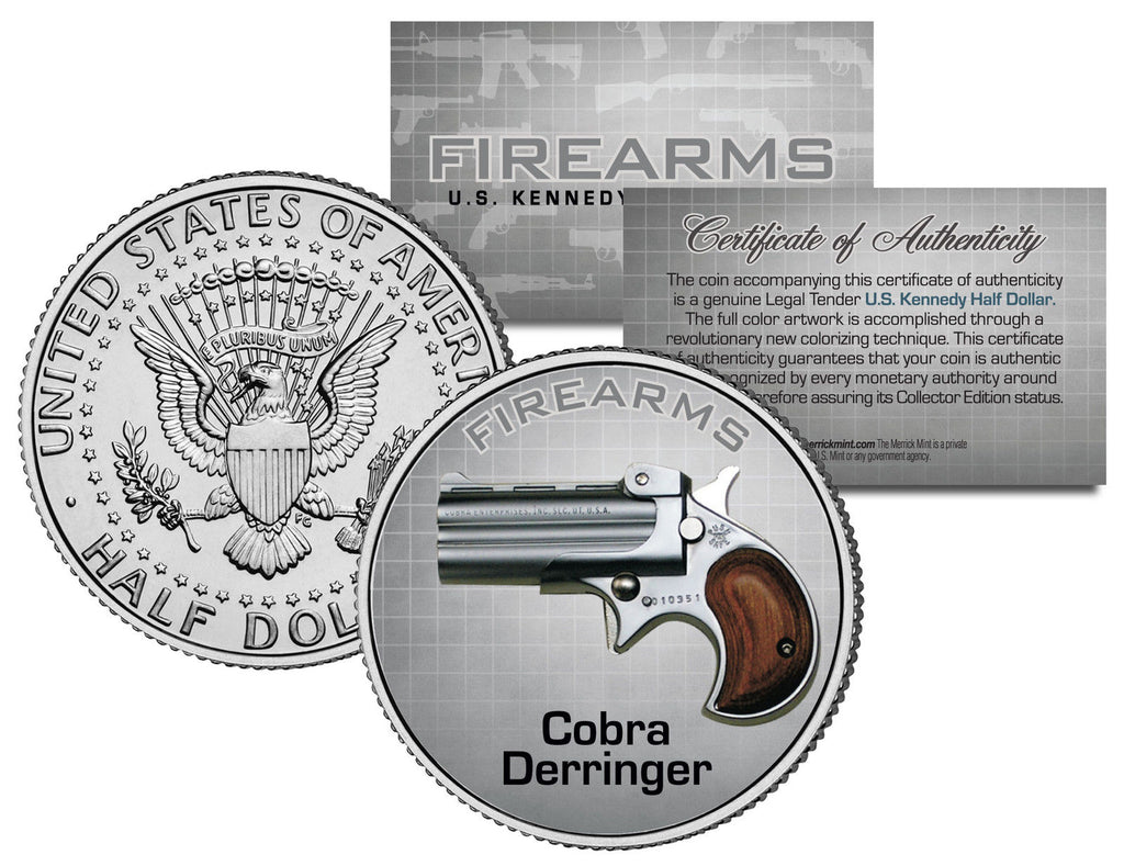FIREARMS SERIES - COBRA DERRINGER Gun. Here is your chance to own an OFFICIAL beautifully colorized JFK Kennedy Half Dollar U.S. Coin. This official high-quality genuine Legal Tender United States Coin has been colorized using a unique multicolor authentic process. Colorizing coins involves the unique application of special inks directly to the surface of a coin using a unique and painstakingly multicolor coin process that achieves a level of detail, color saturation, and durability that is #1 in the industry. The result is an everlasting colorized coin collectible of ultra-high quality. Each coin comes in a premium coin capsule with a Certificate of Authenticity.