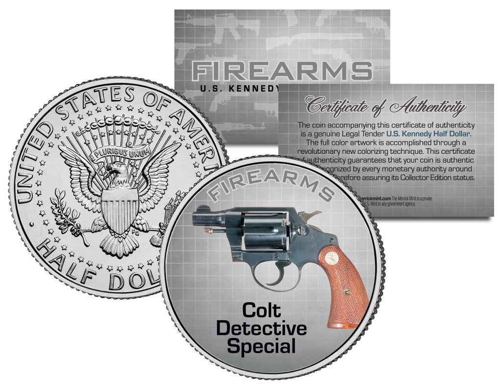 FIREARMS SERIES - COLT DETECTIVE SPECIAL Gun. Here is your chance to own an OFFICIAL beautifully colorized JFK Kennedy Half Dollar U.S. Coin. This official high-quality genuine Legal Tender United States Coin has been colorized using a unique multicolor authentic process. Colorizing coins involves the unique application of special inks directly to the surface of a coin using a unique and painstakingly multicolor coin process that achieves a level of detail, color saturation, and durability that is #1 in the industry. The result is an everlasting colorized coin collectible of ultra-high quality. Each coin comes in a premium coin capsule with a Certificate of Authenticity.