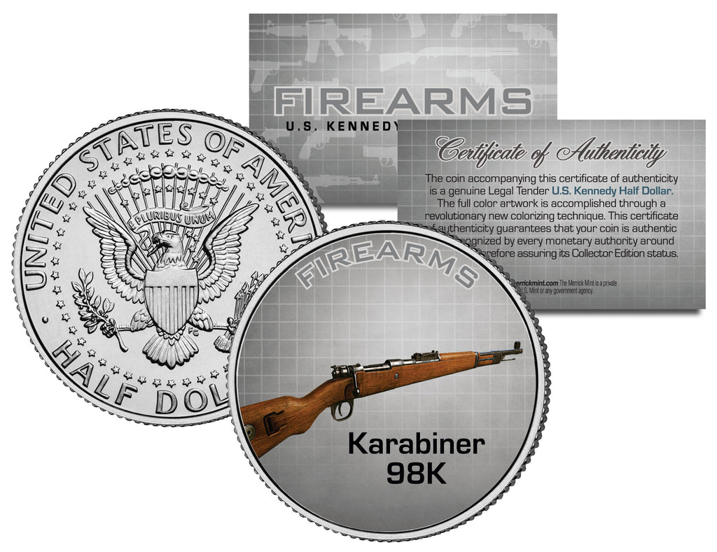 FIREARMS SERIES - Karibiner 98K Rifle Gun. Here is your chance to own an OFFICIAL beautifully colorized JFK Kennedy Half Dollar U.S. Coin. This official high-quality genuine Legal Tender United States Coin has been colorized using a unique multicolor authentic process. Colorizing coins involves the unique application of special inks directly to the surface of a coin using a unique and painstakingly multicolor coin process that achieves a level of detail, color saturation, and durability that is #1 in the industry. The result is an everlasting colorized coin collectible of ultra-high quality. Each coin comes in a premium coin capsule with a Certificate of Authenticity.