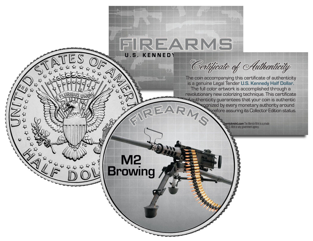 FIREARMS SERIES - M2 BROWING Gun. Here is your chance to own an OFFICIAL beautifully colorized JFK Kennedy Half Dollar U.S. Coin. This official high-quality genuine Legal Tender United States Coin has been colorized using a unique multicolor authentic process. Colorizing coins involves the unique application of special inks directly to the surface of a coin using a unique and painstakingly multicolor coin process that achieves a level of detail, color saturation, and durability that is #1 in the industry. The result is an everlasting colorized coin collectible of ultra-high quality. Each coin comes in a premium coin capsule with a Certificate of Authenticity.