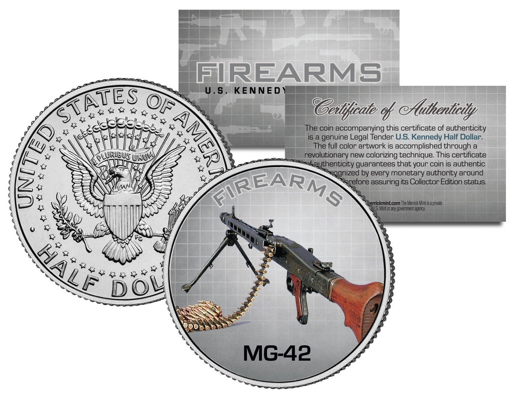 FIREARMS SERIES - MG-42 Gun. Here is your chance to own an OFFICIAL beautifully colorized JFK Kennedy Half Dollar U.S. Coin. This official high-quality genuine Legal Tender United States Coin has been colorized using a unique multicolor authentic process. Colorizing coins involves the unique application of special inks directly to the surface of a coin using a unique and painstakingly multicolor coin process that achieves a level of detail, color saturation, and durability that is #1 in the industry. The result is an everlasting colorized coin collectible of ultra-high quality. Each coin comes in a premium coin capsule with a Certificate of Authenticity.