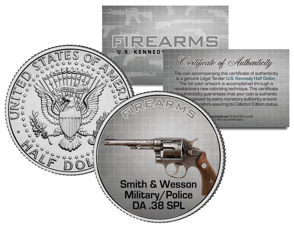 FIREARMS SERIES - Smith & Wesson Military/Police DA .38 SPL Revolver Gun. Here is your chance to own an OFFICIAL beautifully colorized JFK Kennedy Half Dollar U.S. Coin. This official high-quality genuine Legal Tender United States Coin has been colorized using a unique multicolor authentic process. Colorizing coins involves the unique application of special inks directly to the surface of a coin using a unique and painstakingly multicolor coin process that achieves a level of detail, color saturation, and durability that is #1 in the industry. The result is an everlasting colorized coin collectible of ultra-high quality. Each coin comes in a premium coin capsule with a Certificate of Authenticity.