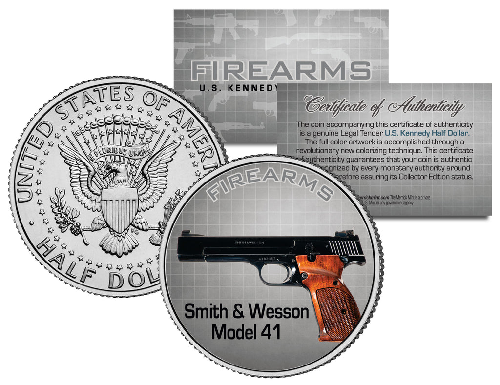 FIREARMS SERIES - Smith & Wesson Model 41 Semi-automatic Pistol Gun. Here is your chance to own an OFFICIAL beautifully colorized JFK Kennedy Half Dollar U.S. Coin. This official high-quality genuine Legal Tender United States Coin has been colorized using a unique multicolor authentic process. Colorizing coins involves the unique application of special inks directly to the surface of a coin using a unique and painstakingly multicolor coin process that achieves a level of detail, color saturation, and durability that is #1 in the industry. The result is an everlasting colorized coin collectible of ultra-high quality. Each coin comes in a premium coin capsule with a Certificate of Authenticity.
