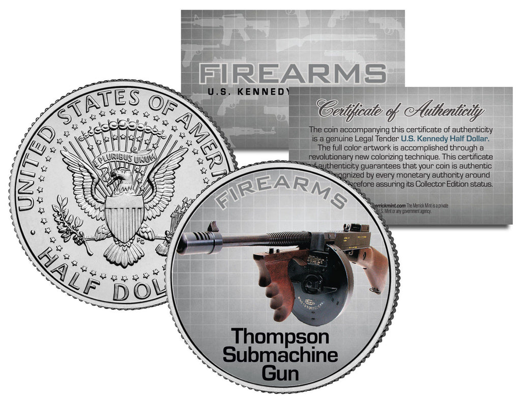 FIREARMS SERIES - THOMPSON SUBMACHINE GUN. Here is your chance to own an OFFICIAL beautifully colorized JFK Kennedy Half Dollar U.S. Coin. This official high-quality genuine Legal Tender United States Coin has been colorized using a unique multicolor authentic process. Colorizing coins involves the unique application of special inks directly to the surface of a coin using a unique and painstakingly multicolor coin process that achieves a level of detail, color saturation, and durability that is #1 in the industry. The result is an everlasting colorized coin collectible of ultra-high quality. Each coin comes in a premium coin capsule with a Certificate of Authenticity.
