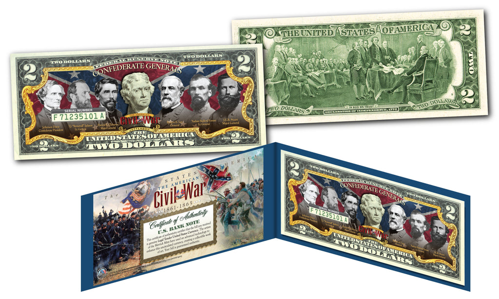 This AMERICAN CIVIL WAR – CONFEDERATE GENERALS uncirculated $2 Bill is Genuine Authentic Legal Tender of the United States, which has been enhanced with colorized images of the most important Confederate Generals. The general officers of the Confederate States Army were the senior military leaders of the Confederacy during the American Civil War of 1861–1865. They were often former officers from the United States Army prior to the Civil War, while others were given the rank based on merit or when necessity demanded. The southern generals were the commanders that led the troops and helped decide the ultimate outcome of most civil war battles. These colorized images are accomplished through a revolutionary new authentic & genuine colorization process pioneered by The Merrick Mint. Included is a blue display portfolio plus a Certificate of Authenticity to guaranty that your bills are authentic and recognized by every monetary authority around the world, and assuring its Collector Edition status. Only genuine Legal Tender $2 United States Bills are used for this unique colorization process. Each $2 Bill is in FRESH, CRISP, UNCIRCULATED condition, and was directly removed from untouched wrapped Federal Reserve sealed packs. Former U.S. President Thomas Jefferson is featured on the obverse of the note, along with the special colorization overlay. The Signing of the Declaration of Independence by John Trumbull is featured on the reverse. It is the only U.S. Currency note that features two Presidents, John Adams and Thomas Jefferson, and it is one of the most rarely seen BILLS in circulation and actual use.