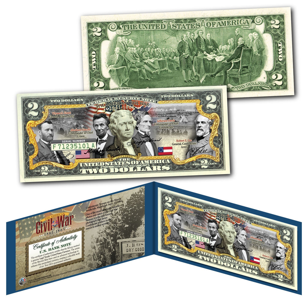 This American CIVIL WAR Confederate & Union Generals/Commanders uncirculated $2 Bill is Genuine Authentic Legal Tender of the United States, which has been enhanced with colorized images of the most important Confederate & Union Generals/Commanders. The general officers of the Confederate States Army were the senior military leaders of the Confederacy during the American Civil War of 1861–1865. The southern generals were the commanders that led the troops and made decisions for the South during battles. The Union Army, or Federal Army as it was also known, was the United States Army land force that fought to keep and preserve the Union of the collective states, proving essential in the preserving of the United States of America as a working, viable republic. The northern generals were the commanders that led the troops in the North and helped decide the ultimate outcome of most civil war battles. To the end, The Union Army bravely fought and ultimately triumphed over the efforts of the Confederate Army in the American Civil War. This bill features images of the most important leaders of the Confederate, Robert E. Lee and Jefferson Davis and the most important Union leaders, Abraham Lincoln and Ulysses S. Grant. These colorized images are accomplished through a revolutionary new authentic & genuine colorization process pioneered by The Merrick Mint. Included is a blue display portfolio plus a Certificate of Authenticity to guaranty that your bills are authentic and recognized by every monetary authority around the world, and assuring its Collector Edition status. Only genuine Legal Tender $2 United States Bills are used for this unique colorization process. Each $2 Bill is in FRESH, CRISP, UNCIRCULATED condition, and was directly removed from untouched wrapped Federal Reserve sealed packs. Former U.S. President Thomas Jefferson is featured on the obverse of the note, along with the special colorization overlay. The Signing of the Declaration of Independence by John Trumbull is featured on the reverse. It is the only U.S. Currency note that features two Presidents, John Adams and Thomas Jefferson, and it is one of the most rarely seen BILLS in circulation and actual use.