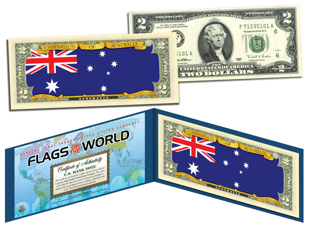 AUSTRALIA - Official Flags of the World Genuine Legal Tender U.S. $2 Two-Dollar Bill Currency Bank Note