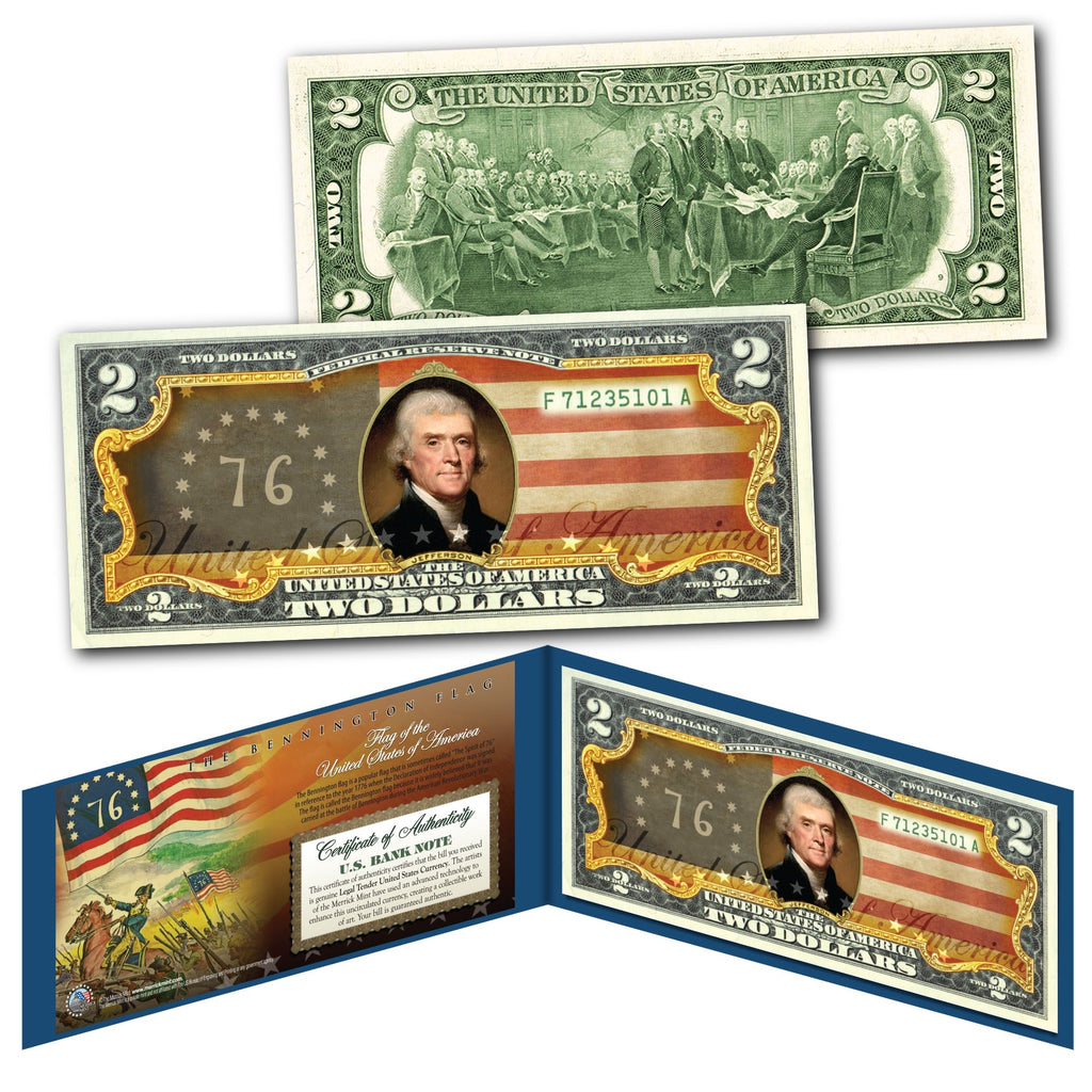This BENNINGTON FLAG uncirculated $2 Bill is Genuine Authentic Legal Tender of the United States, which has been enhanced with beautiful colorized images. The Bennington flag is a popular flag that is sometimes called "The Spirit of 76" in reference to the year 1776 when the Declaration of Independence was signed. The flag is called the Bennington flag because it is widely believed that it was carried at the battle of Bennington during the American Revolutionary War. The full colorized images are accomplished through a revolutionary new authentic & genuine colorization process pioneered by The Merrick Mint, creating a collectible work of art. Each bill comes displayed in a blue folio with a Certificate of Authenticity to guarantee that your bills are authentic and recognized by every monetary authority around the world, therefore assuring its Collector Edition status. Each $2 Bill is in FRESH, CRISP, UNCIRCULATED condition, and was directly removed from untouched wrapped Federal Reserve sealed packs. Former U.S. President Thomas Jefferson is featured on the obverse of the note, along with the special colorization overlay. The Signing of the Declaration of Independence by John Trumbull is featured on the reverse. It is the only U.S. Currency note that features two Presidents, John Adams and Thomas Jefferson, and it is one of the most rarely seen BILLS in circulation and actual use.