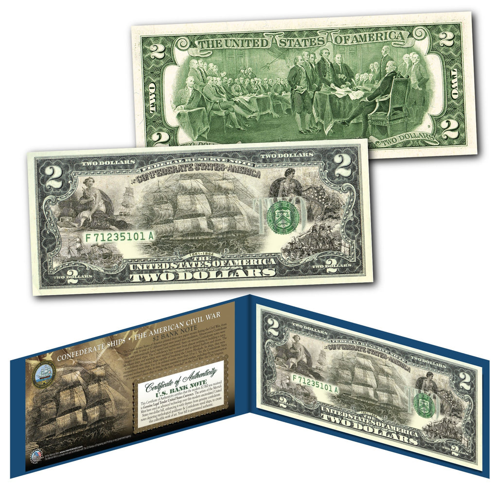 This CONFEDERATE SHIPS Currency of The American Civil War uncirculated U.S. $2 Bill is Genuine Authentic Legal Tender of the United States, which has been enhanced with beautiful colorized images on top of a new $2 Bill. The Confederate States of America printed their own paper money during the Civil War, from 1861 to 1864. A total of 70 different types were issued into circulation. Almost every Confederate note was painstakingly hand signed and numbered. Seen on several Confederate notes were images of naval ships. The Confederacy had to start from almost nothing in building a navy. Merchant ships and warships were needed to transport and to defend harbors and rivers. The Confederate also needed ships capable of breaking the Union Blockade. In ships, the were outnumbered more than 3 to 1; in enlisted ranks, more than 10 to 1. Yet, the Confederate Navy employed technologies that, in time, became essential to naval warfare, including the reconstruction of a captured Union ship to make the first "ironclad" in the Civil War: the CSS Virginia. The colorized images are accomplished through a revolutionary new authentic & genuine colorization process pioneered by The Merrick Mint, creating a collectible work of art. Each bill comes displayed in a blue folio with a Certificate of Authenticity to guarantee that your bills are authentic and recognized by every monetary authority around the world, therefore assuring its Collector Edition status. Each $2 Bill is in FRESH, CRISP, UNCIRCULATED condition, and was directly removed from untouched wrapped Federal Reserve sealed packs. Former U.S. President Thomas Jefferson is featured on the obverse of the note, along with the special colorization overlay. The Signing of the Declaration of Independence by John Trumbull is featured on the reverse. It is the only U.S. Currency note that features two Presidents, John Adams and Thomas Jefferson, and it is one of the most rarely seen BILLS in circulation and actual use.