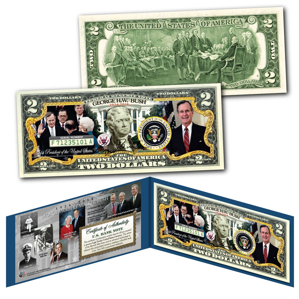 This GEORGE H.W. BUSH 1924-2018 Commemorative uncirculated $2 Bill is Genuine Authentic Legal Tender of the United States, which has been enhanced with beautiful colorized images. The full colorized images are accomplished through a revolutionary new authentic & genuine colorization process pioneered by The Merrick Mint. Included is a Certificate of Authenticity to guarantee that your bills are authentic and recognized by every monetary authority around the world, and assuring its Collector Edition status. Only genuine Legal Tender $2 United States Bills are used for this unique colorization process. Each $2 Bill is in FRESH, CRISP, UNCIRCULATED condition, and was directly removed from untouched wrapped Federal Reserve sealed packs. Former U.S. President Thomas Jefferson is featured on the obverse of the note, along with the special colorization overlay. The Signing of the Declaration of Independence by John Trumbull is featured on the reverse. It is the only U.S. Currency note that features two Presidents, John Adams and Thomas Jefferson, and it is one of the most rarely seen BILLS in circulation and actual use.