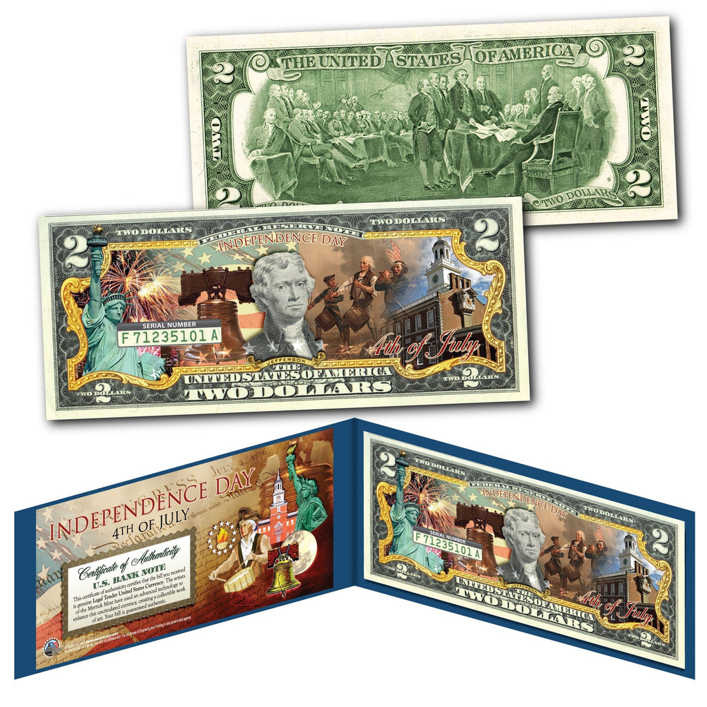 This INDEPENDENCE DAY 4th of July uncirculated U.S. $2 Bill is Genuine Authentic Legal Tender of the United States, which has been enhanced with beautiful colorized images. It features all historical images from the 1976 U.S Bicentennial Coins. Each bill comes displayed in a blue folio with a Certificate of Authenticity to guarantee that your bills are authentic and recognized by every monetary authority around the world, therefore assuring its Collector Edition status. Each $2 Bill is in FRESH, CRISP, UNCIRCULATED condition, and was directly removed from untouched wrapped Federal Reserve sealed packs. Former U.S. President Thomas Jefferson is featured on the obverse of the note, along with the special colorization overlay. The Signing of the Declaration of Independence by John Trumbull is featured on the reverse. It is the only U.S. Currency note that features two Presidents, John Adams and Thomas Jefferson, and it is one of the most rarely seen BILLS in circulation and actual use.