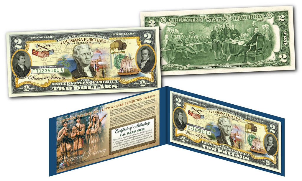 This LOUISIANA PURCHASE Lewis & Clark uncirculated $2 Bill is Genuine Authentic Legal Tender of the United States, which has been enhanced with beautiful colorized images. The full colorized images are accomplished through a revolutionary new authentic & genuine colorization process pioneered by The Merrick Mint. Included is a Certificate of Authenticity to guarantee that your bills are authentic and recognized by every monetary authority around the world, and assuring its Collector Edition status. Only genuine Legal Tender $2 United States Bills are used for this unique colorization process. Each $2 Bill is in FRESH, CRISP, UNCIRCULATED condition, and was directly removed from untouched wrapped Federal Reserve sealed packs. Former U.S. President Thomas Jefferson is featured on the obverse of the note, along with the special colorization overlay. The Signing of the Declaration of Independence by John Trumbull is featured on the reverse. It is the only U.S. Currency note that features two Presidents, John Adams and Thomas Jefferson, and it is one of the most rarely seen BILLS in circulation and actual use.