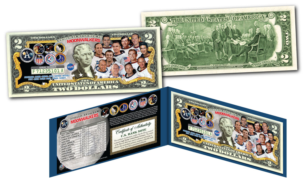 This MOONWALKERS uncirculated $2 Bill is Genuine Authentic Legal Tender of the United States, which has been enhanced with beautiful colorized images. These twelve astronauts walked on the Moon's surface, and six of those drove Lunar Roving Vehicles on the Moon. While three astronauts flew to the Moon twice, of which two landed, none landed on the Moon more than once. The nine Apollo missions to the Moon occurred between December 1968 and December 1972. The twelve who walked on the Moon are the only people ever to have set foot on an astronomical object other than the Earth.
