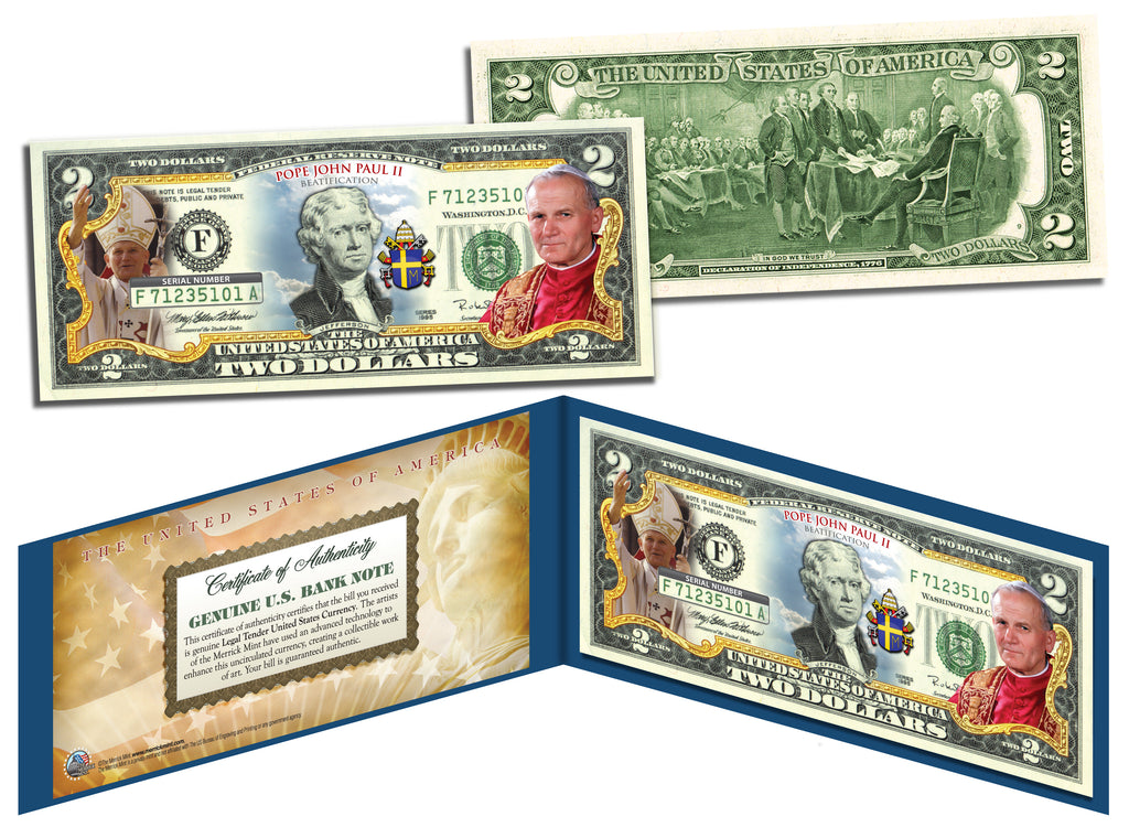 This uncirculated $2 Bill is Genuine Authentic Legal Tender of the United States, which has been enhanced with beautiful colorized images of Pope John Paul II commemorating his formal beatification ceremony that took place on 1 May 2011. The full colorized images are accomplished through a revolutionary new authentic & genuine colorization process pioneered by The Merrick Mint. Included is a Certificate of Authenticity to guaranty that your bills are authentic and recognized by every monetary authority around the world, and assuring its Collector Edition status. You hardly ever see two dollar bills these days. As a matter of fact, you are ten times more likely to see a hundred dollar bill in general circulation compared to the humble two dollar bill! That's just one reason to take advantage of this exciting offer for collectors! Amazingly, the artists of the Merrick Mint have used its advanced technology to enhance the collectability of this uncirculated currency. These pristine condition $2 bills are a spectacular currency collectible and a unique gift. Due to the painstaking colorization process, only a limited number of these bills are currently available.