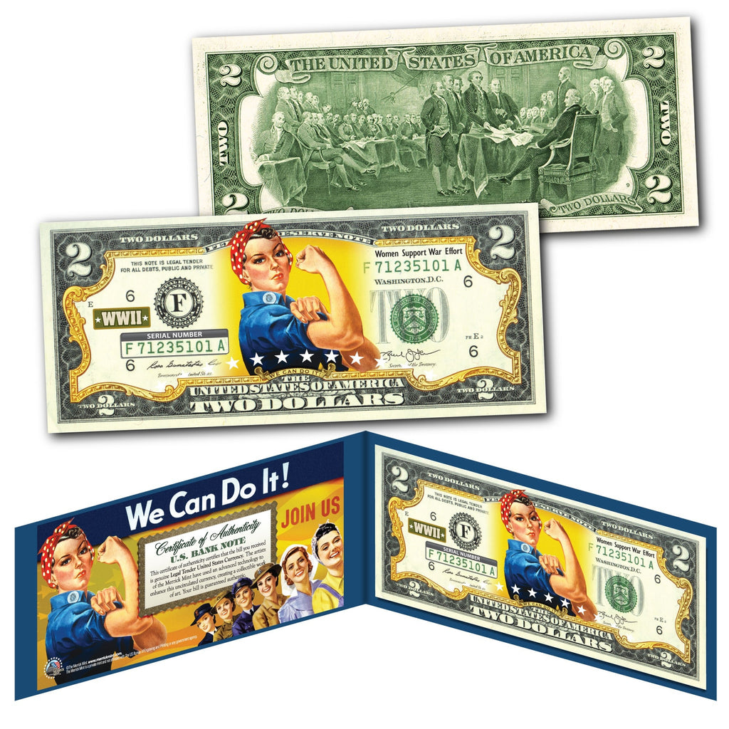 This ROSIE THE RIVETER " We Can Do It " uncirculated U.S. $2 Bill is Genuine Authentic Legal Tender of the United States, which has been enhanced with beautiful colorized images. The colorized images are accomplished through a revolutionary new authentic & genuine colorization process pioneered by The Merrick Mint, creating a collectible work of art. Each bill comes displayed in a blue folio with a Certificate of Authenticity to guarantee that your bills are authentic and recognized by every monetary authority around the world, therefore assuring its Collector Edition status. Each $2 Bill is in FRESH, CRISP, UNCIRCULATED condition, and was directly removed from untouched wrapped Federal Reserve sealed packs. Former U.S. President Thomas Jefferson is featured on the obverse of the note, along with the special colorization overlay. The Signing of the Declaration of Independence by John Trumbull is featured on the reverse. It is the only U.S. Currency note that features two Presidents, John Adams and Thomas Jefferson, and it is one of the most rarely seen BILLS in circulation and actual use.