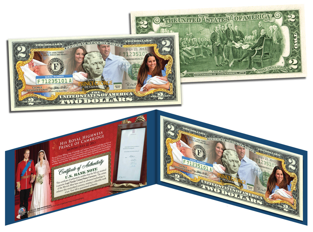 This uncirculated $2 Bill is Genuine Authentic Legal Tender of the United States, which has been enhanced with beautiful colorized images marking the birth of the ROYAL BABY on 22 July 2013. Prince George of Cambridge (George Alexander Louis) is the son of Prince William, Duke of Cambridge and Catherine, Duchess of Cambridge. The full colorized images are accomplished through a revolutionary new authentic & genuine colorization process pioneered by The Merrick Mint. Included is a Certificate of Authenticity to guaranty that your bills are authentic and recognized by every monetary authority around the world, and assuring its Collector Edition status. Only genuine Legal Tender $2 United States Bills are used for this unique colorization process. Each $2 Bill is in FRESH, CRISP, UNCIRCULATED condition, and was directly removed from untouched wrapped Federal Reserve sealed packs. Former U.S. President Thomas Jefferson is featured on the obverse of the note, along with the special colorization overlay. The Signing of the Declaration of Independence by John Trumbull is featured on the reverse. It is the only U.S. Currency note that features two Presidents, John Adams and Thomas Jefferson, and it is one of the most rarely seen BILLS in circulation and actual use.