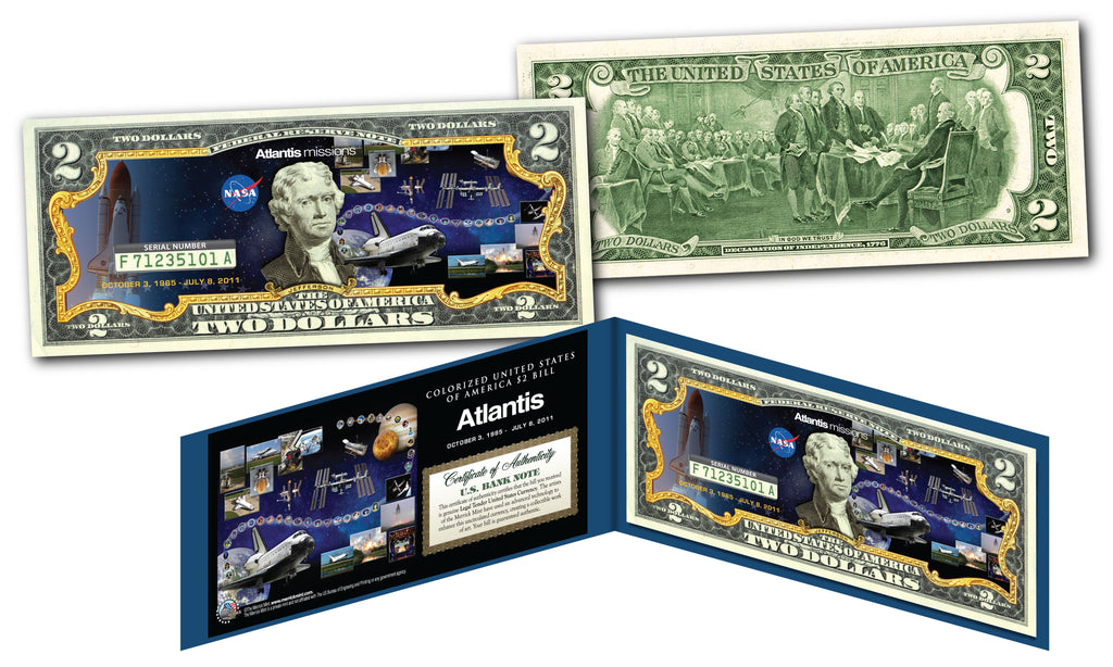 This Space Shuttle ATLANTIS uncirculated $2 Bill is Genuine Authentic Legal Tender of the United States, which has been enhanced with beautiful colorized images of the spacecraft. Space Shuttle Atlantis is a Space Shuttle orbiter belonging to the National Aeronautics and Space Administration (NASA), the spaceflight and space exploration agency of the United States. Constructed by the Rockwell International company in Southern California and delivered to the Kennedy Space Center in Eastern Florida in April 1985, Atlantis is the fourth operational and the second-to-last Space Shuttle built. Its maiden flight was STS-51-J from 3 to 7 October 1985. Atlantis embarked on its 33rd and final mission, also the final mission of a space shuttle, STS-135, on 8 July 2011.