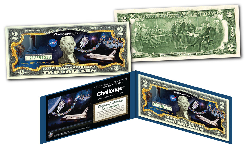 This Space Shuttle CHALLENGER uncirculated $2 Bill is Genuine Authentic Legal Tender of the United States, which has been enhanced with beautiful colorized images of the spacecraft. On January 28, 1986, the NASA shuttle orbiter mission STS-51-L and the tenth flight of Space Shuttle Challenger broke apart 73 seconds into its flight, killing all seven crew members, which consisted of five NASA astronauts and two payload specialists. The spacecraft disintegrated over the Atlantic Ocean, off the coast of Cape Canaveral, Florida, at 11:39. The disintegration of the vehicle began after a joint in its right solid rocket booster failed at liftoff. The failure was caused by the fact that O-ring seals used in the joint were not designed to handle the unusually cold conditions that existed at this launch. The seals' failure caused a breach in the SRB joint, allowing pressurized burning gas from within the solid rocket motor to reach the outside and impinge upon the adjacent SRB aft field joint attachment hardware and external fuel tank. This led to the separation of the right-hand SRB's aft field joint attachment and the structural failure of the external tank. The crew compartment and many other vehicle fragments were eventually recovered from the ocean floor after a lengthy search and recovery operation. The exact timing of the death of the crew is unknown; several crew members are known to have survived the initial breakup of the spacecraft. The shuttle had no escape system, and the impact of the crew compartment with the ocean surface was too violent to be survivable.