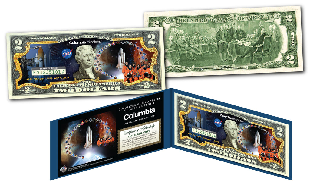This Space Shuttle COLUMBIA uncirculated $2 Bill is Genuine Authentic Legal Tender of the United States, which has been enhanced with beautiful colorized images of the spacecraft. Space Shuttle Columbia was the first space-rated orbiter in NASA's Space Shuttle fleet. It launched for the first time on mission STS-1 on April 12, 1981, the first flight of the Space Shuttle program. Over 22 years of service it completed 27 missions before disintegrating during re-entry near the end of its 28th mission, STS-107 on February 1, 2003, resulting in the deaths of all seven crew members.