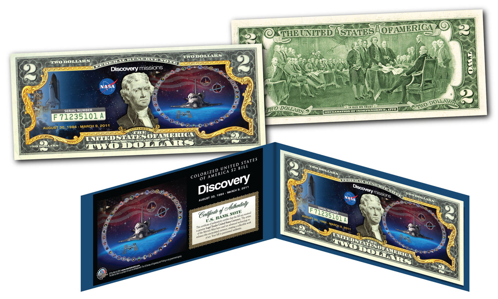 This Space Shuttle DISCOVERY uncirculated $2 Bill is Genuine Authentic Legal Tender of the United States, which has been enhanced with beautiful colorized images of the spacecraft. Space Shuttle Discovery is one of the orbiters from NASA's Space Shuttle program and the third of five fully operational orbiters to be built. Its first mission, STS-41-D, flew from August 30 to September 5, 1984. Over 27 years of service it launched and landed 39 times, gathering more spaceflights than any other spacecraft to date. Discovery became the third operational orbiter to enter service, preceded by Columbia and Challenger. It embarked on its last mission, STS-133, on February 24, 2011 and touched down for the final time at Kennedy Space Center on March 9, having spent a cumulative total of almost a full year in space. Discovery performed both research and International Space Station (ISS) assembly missions. It also carried the Hubble Space Telescope into orbit. Discovery was the first operational shuttle to be retired, followed by Endeavour and then Atlantis.