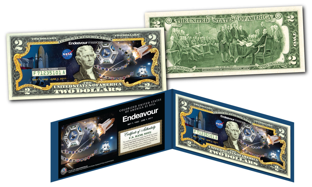 This Space Shuttle ENDEAVOUR uncirculated $2 Bill is Genuine Authentic Legal Tender of the United States, which has been enhanced with beautiful colorized images of the spacecraft. Space Shuttle Endeavour is a retired orbiter from NASA's Space Shuttle program and the fifth and final operational shuttle built. It embarked on its first mission, STS-49, in May 1992 and its 25th and final mission, STS-134, in May 2011. STS-134 was expected to be the final mission of the Space Shuttle program, but with the authorization of STS-135, Atlantis became the last shuttle to fly.The United States Congress approved the construction of Endeavour in 1987 to replace Challenger, which was lost in 1986.