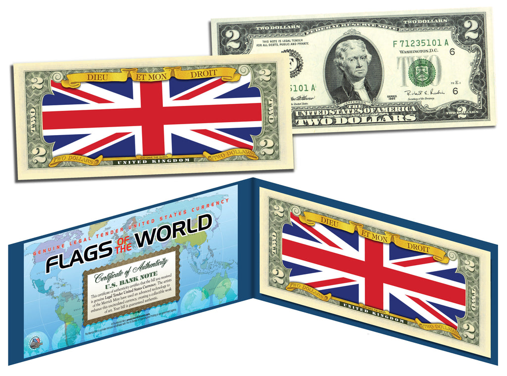 • UNITED KINGDOM - Official Flags of the World Genuine Legal Tender U.S. $2 Two-Dollar Bill Currency Bank Note