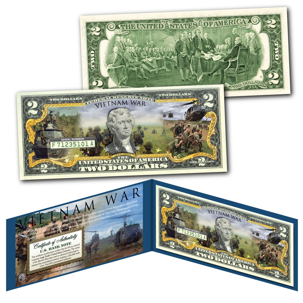 This VIETNAM WAR uncirculated U.S. $2 Bill is Genuine Authentic Legal Tender of the United States, which has been enhanced with beautiful colorized images. The Vietnam War was a protracted conflict from 1954 to 1975 that pitted the communist government of North Vietnam and its allies in South Vietnam - known as the Viet Cong - against the government of South Vietnam and its principal ally, the United States. The war was part of a larger regional conflict and a manifestation of the Cold War between the United States and the Soviet Union and their respective allies. The colorized images are accomplished through a revolutionary new authentic & genuine colorization process pioneered by The Merrick Mint, creating a collectible work of art. Each bill comes displayed in a blue folio with a Certificate of Authenticity to guarantee that your bills are authentic and recognized by every monetary authority around the world, therefore assuring its Collector Edition status. Each $2 Bill is in FRESH, CRISP, UNCIRCULATED condition, and was directly removed from untouched wrapped Federal Reserve sealed packs. Former U.S. President Thomas Jefferson is featured on the obverse of the note, along with the special colorization overlay. The Signing of the Declaration of Independence by John Trumbull is featured on the reverse. It is the only U.S. Currency note that features two Presidents, John Adams and Thomas Jefferson, and it is one of the most rarely seen BILLS in circulation and actual use.