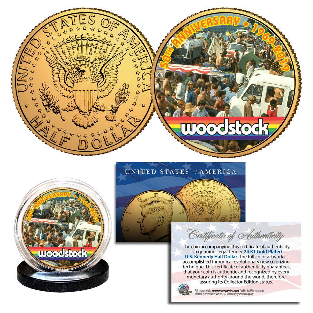 This is the WOODSTOCK 50th Anniversary collectible coin. Here is your opportunity to own or to gift, a beautifully colorized Eisenhower Ike Dollar U.S. Coin, which has been layered in Genuine 24 Karat Gold, and then enhanced with a beautiful colorized image by the Merrick Mint. Woodstock was a music festival held August 15–18, 1969, in Bethel, New York. It took place only 43 miles southwest of Woodstock, and unexpectedly attracted an audience of more than 400,000. The festival has become widely regarded as a pivotal moment in popular music history, as well as a defining event for the generation. This coin is to commemorate the 50th anniversary of the a landmark festival. This high-quality genuine Legal Tender U.S. coin has been colorized using a unique painstaking multi-color authentic process by the Merrick Mint. Colorizing coins involves the unique application of special inks directly to the surface of a coin that achieves a level of detail, color saturation, and durability that is #1 in the coin industry. The result is an everlasting colorized coin collectible of ultra-high quality. Each coin comes in a premium coin capsule with a Certificate of Authenticity to guarantee that your coin is authentic and recognized by every monetary authority around the world, assuring its Collector Edition status.