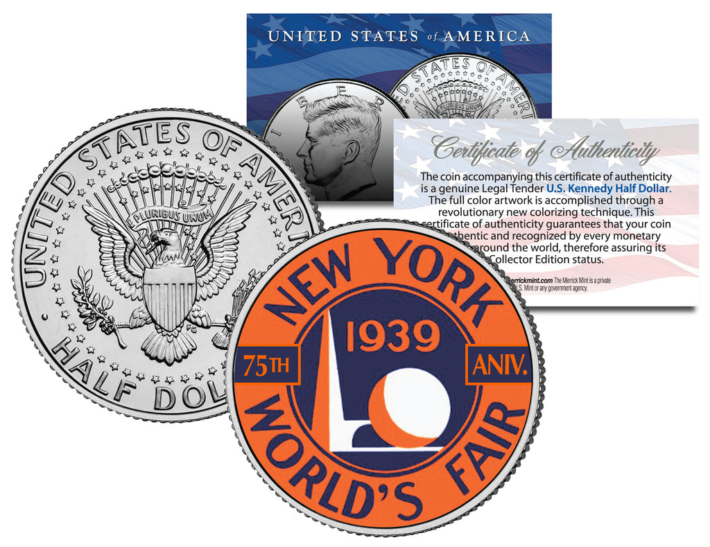 Here is your opportunity to own or gift the “1939 NEW YORK WORLD’S FAIR – 75TH ANNIVERSARY” colorized 2014 JFK Kennedy Half Dollar U.S. Coin, which has been enhanced with a beautifully colorized image by the Merrick Mint. Each coin comes in a premium coin capsule with a full color Certificate of Authenticity to guarantee that your coin is authentic and recognized by every monetary authority around the world. This Legal Tender United States coin has been colorized with an application of special inks directly to the surface of the coin, using a unique and painstakingly multicolor coin process, which achieves a level of detail, color saturation, and durability that is #1 in the coin industry. The result is an everlasting colorized coin collectible of ultra-high quality. The 2014 Kennedy half dollar is a U.S. fifty cent coin with mint marks chosen at random.