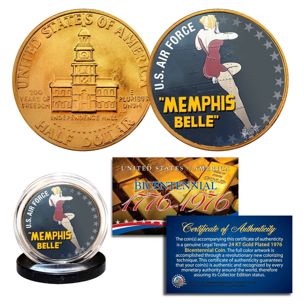 This MEMPHIS BELLE coin is a treasured collectible, combining World War II with coin collecting. Here is your chance to own a beautifully colorized 24KT Gold Plated Bicentennial 1976 JFK Kennedy Half Dollar U.S. Coin. This high-quality genuine Legal Tender U.S. coin has been layered in Genuine 24 Karat Gold, and then enhanced with beautiful colorized images using a unique painstaking multicolor authentic process by the Merrick Mint. Colorizing coins involves the unique application of special inks directly to the surface of a coin that achieves a level of detail, color saturation, and durability that is #1 in the coin industry. The result is an everlasting colorized coin collectible of ultra-high quality. Each coin comes in a premium coin capsule with a Certificate of Authenticity to guaranty that your coin is authentic and recognized by every monetary authority around the world, assuring its Collector Edition status. The Bicentennial 1976 Kennedy half dollar is a U.S. fifty cent coin with mint marks chosen at random. Memphis Belle is the nickname of a Boeing B-17F Flying Fortress during the Second World War that inspired the making of two motion pictures. The aircraft was one of the first B-17 United States Army Air Corps heavy bombers to complete 25 combat missions with her crew intact.