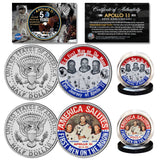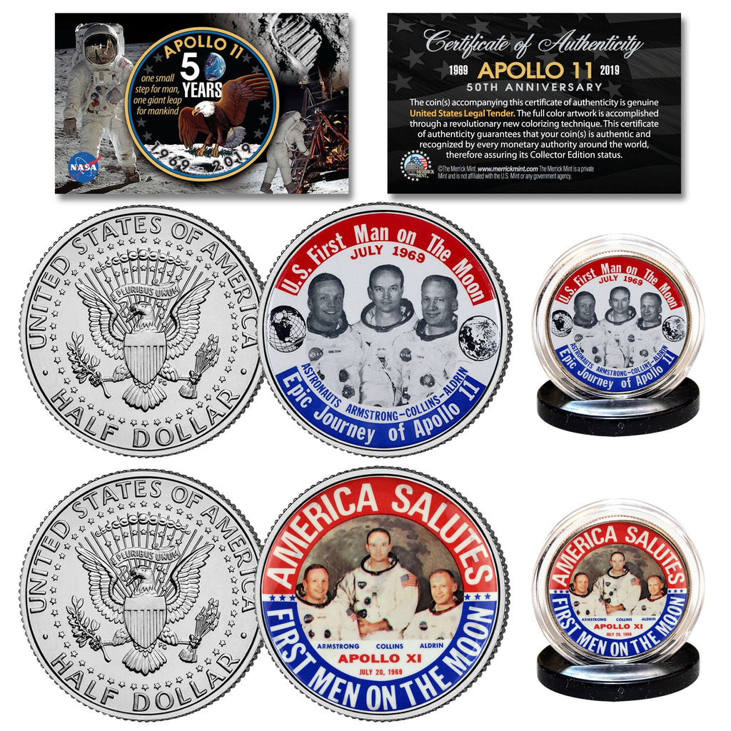 This APOLLO 11 50th Anniversary complete 2-coin set is a treasured collectible. Here is your chance to own beautifully colorized JFK Kennedy Half Dollar U.S. Coins. This Apollo 11 2-coin set commemorates the 50th anniversary of the first human landing on the moon. On July 20, 1969, after the Apollo 1 tragedy and series of successful tests in Earth and lunar orbit, Apollo 11 astronauts Neil Armstrong and Buzz Aldrin guided their Eagle lander to Tranquility Base on the surface of the moon while crewmate Michael Collins circled above inside the command module Columbia. The Apollo missions were the answer to a challenge issued by President John F. Kennedy to put a man on the moon. The landing marked success for the U.S. over the Soviet Union, and has since been billed as the Space Race. This remains among NASA's pinnacle achievement since its inception. Each coin comes in a premium coin capsule. The set comes with a Certificate of Authenticity to guarantee that your coins are authentic and recognized by every monetary authority around the world, assuring its Collector Edition status. Images on the coins are from the Original 1969 NASA Buttons. Armstrong, Collins, Aldrin...first Man on Moon.