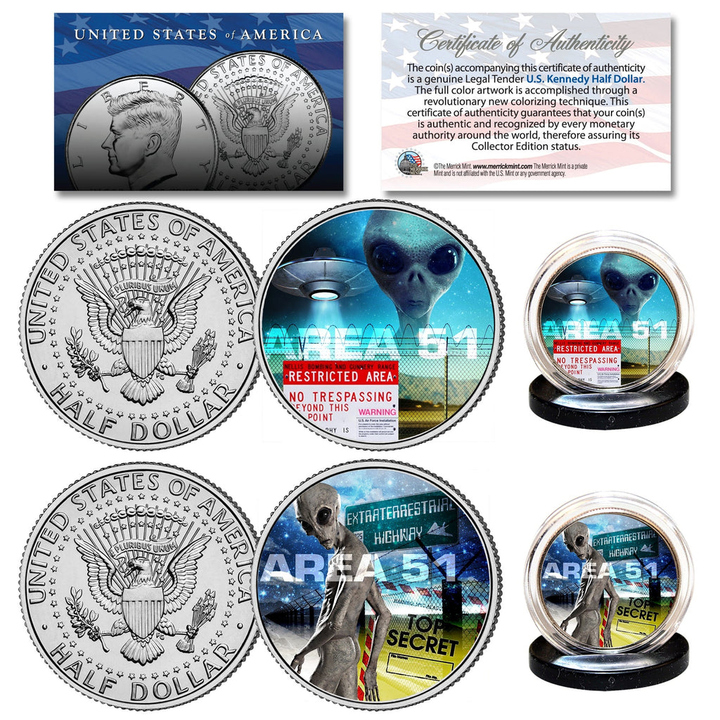 This AREA 51 2-coin set is a treasured collectible. Here is your chance to own beautifully colorized JFK Kennedy Half Dollar U.S. Coins. These high-quality genuine Legal Tender U.S. coins have been colorized using a unique painstaking multicolor authentic process. Colorizing coins involves the unique application of special inks directly to the surface of a coin that achieves a level of detail, color saturation, and durability that is #1 in the coin industry. The result is an everlasting colorized coin collectible of ultra-high quality. Each coin comes in a premium coin capsule. The set comes with a Certificate of Authenticity to guarantee that your coins are authentic and recognized by every monetary authority around the world, assuring its Collector Edition status.