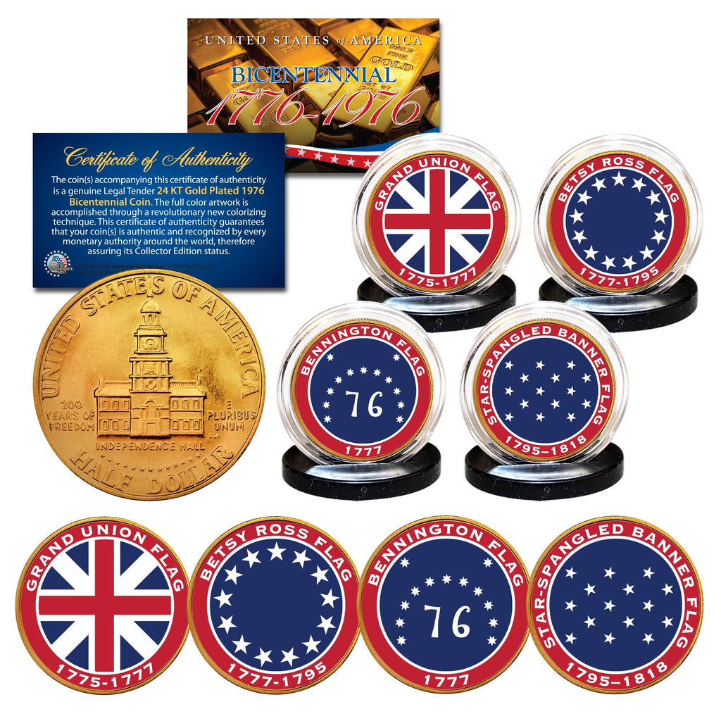 HISTORIC FLAGS of The United States of America 24K Gold Plated 1976 Bicentennial U.S. JFK Kennedy Half Dollar 4-Coin Set. This set features images of four of the most historical US flags in USA History...GRAND UNION FLAG, BETSY ROSS FLAG, BENNINGTON FLAG, STAR-SPANGLED BANNER FLAG.