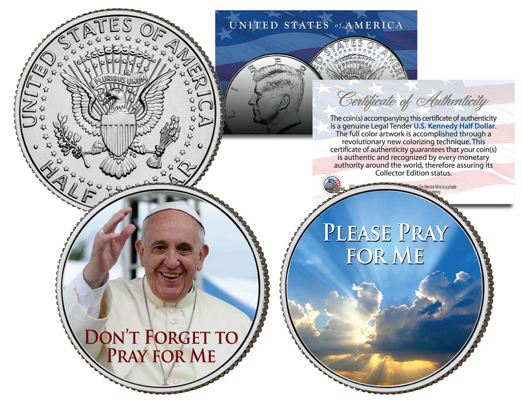 Here is your chance to own the POPE FRANCIS – PLEASE DON'T FORGET TO PRAY FOR ME complete set of two (2) colorized 2015 JFK Kennedy Half Dollar U.S. Coins. These high-quality, genuine Legal Tender United States coins have been colorized using a unique painstaking multi-color authentic process by the Merrick Mint. Colorizing coins involves the unique application of special inks directly to the surface of a coin that achieves a level of detail, color saturation, and durability that is #1 in the coin industry. The result is an everlasting colorized coin collectible of ultra-high quality. Each coin comes in a premium coin capsule with a display stand. The 2-coin set comes with a Certificate of Authenticity to guarantee that your coins are authentic and recognized by every monetary authority around the world, assuring its Collector Edition status.