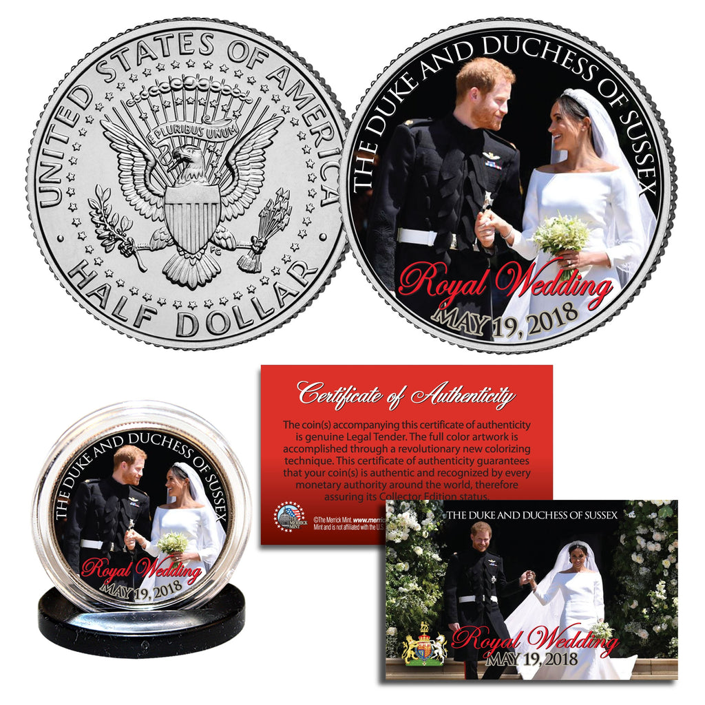 The world watched on May 19, 2018 as the lovely Meghan Markle married her dashing Prince Harry. To commemorate this significant occasion, The Merrick Mint has commissioned this stunning colorized Genuine Kennedy Half Dollar Coin with an actual image from the Royal Wedding on May 19, 2018. With an image that perfectly reflects the pure joy on the day Prince Harry and Meghan exchanged their vows, this Collector's Edition coin is an unforgettable way to relive a royal celebration that will go down in history! Commemorate the fairy tale royal wedding of The Duke and Duchess of Sussex, with this magnificent Genuine Kennedy Half Dollar Colorized Coin. Each coin comes in a premium coin capsule with a display stand. Each coin comes with a Certificate of Authenticity to guarantee that your coin is authentic and recognized by every monetary authority around the world, assuring its Collector Edition status.
