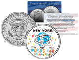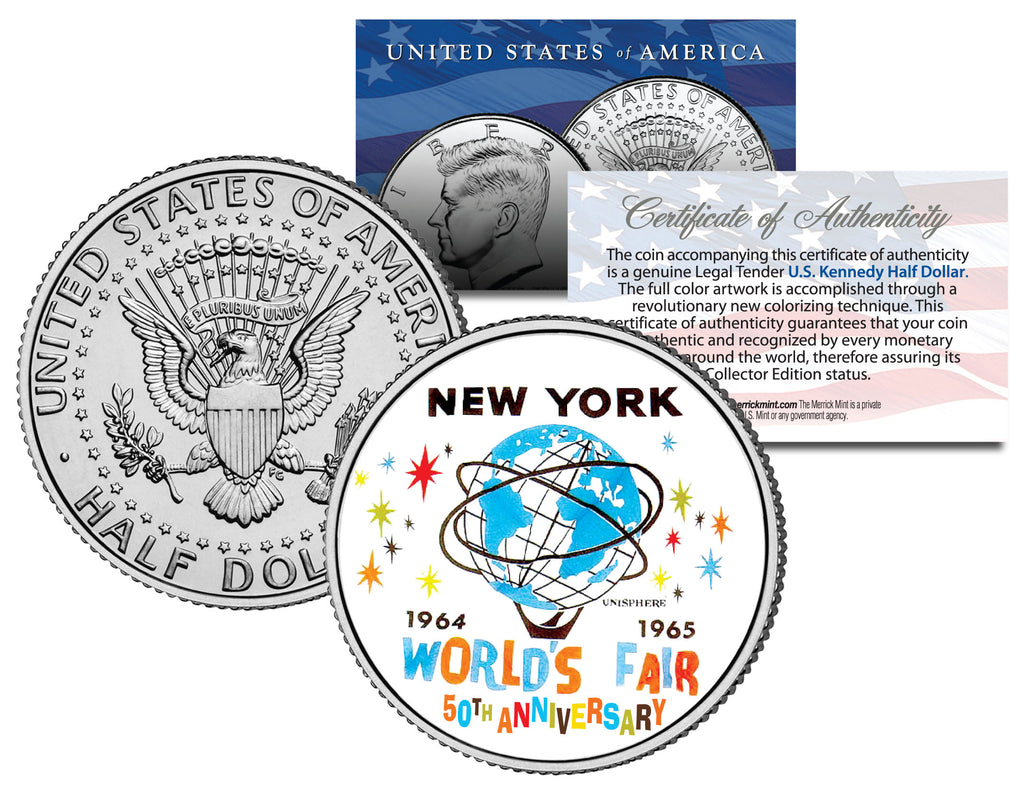 Here is your opportunity to own or gift the “1964-65 NEW YORK WORLD’S FAIR – 50TH ANNIVERSARY” colorized 2014 JFK Kennedy Half Dollar U.S. Coin, which has been enhanced with a beautifully colorized image by the Merrick Mint. Each coin comes in a premium coin capsule with a full color Certificate of Authenticity to guarantee that your coin is authentic and recognized by every monetary authority around the world. This Legal Tender United States coin has been colorized with an application of special inks directly to the surface of the coin, using a unique and painstakingly multicolor coin process, which achieves a level of detail, color saturation, and durability that is #1 in the coin industry. The result is an everlasting colorized coin collectible of ultra-high quality. The 2014 Kennedy half dollar is a U.S. fifty cent coin with mint marks chosen at random.