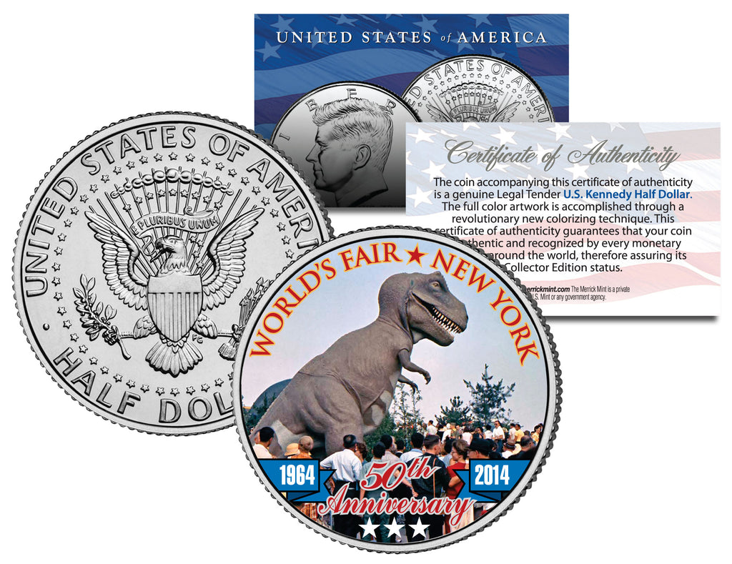 Here is your opportunity to own or gift the “NEW YORK WORLD’S FAIR – 1964-2014 - 50TH ANNIVERSARY - TYRANNOSAURUS T. REX ” colorized 2014 JFK Kennedy Half Dollar U.S. Coin, which has been enhanced with a beautifully colorized image by the Merrick Mint. Each coin comes in a premium coin capsule with a full color Certificate of Authenticity to guarantee that your coin is authentic and recognized by every monetary authority around the world. This Legal Tender United States coin has been colorized with an application of special inks directly to the surface of the coin, using a unique and painstakingly multicolor coin process, which achieves a level of detail, color saturation, and durability that is #1 in the coin industry. The result is an everlasting colorized coin collectible of ultra-high quality. The 2014 Kennedy half dollar is a U.S. fifty cent coin with mint marks chosen at random.