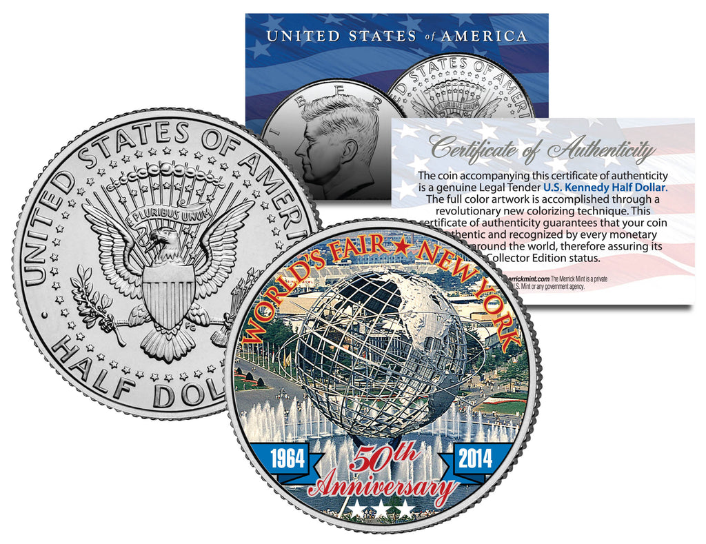 Here is your opportunity to own or gift the “NEW YORK WORLD’S FAIR – 1964-2014 - 50TH ANNIVERSARY - UNISPHERE” colorized 2014 JFK Kennedy Half Dollar U.S. Coin, which has been enhanced with a beautifully colorized image by the Merrick Mint. Each coin comes in a premium coin capsule with a full color Certificate of Authenticity to guarantee that your coin is authentic and recognized by every monetary authority around the world. This Legal Tender United States coin has been colorized with an application of special inks directly to the surface of the coin, using a unique and painstakingly multicolor coin process, which achieves a level of detail, color saturation, and durability that is #1 in the coin industry. The result is an everlasting colorized coin collectible of ultra-high quality. The 2014 Kennedy half dollar is a U.S. fifty cent coin with mint marks chosen at random.