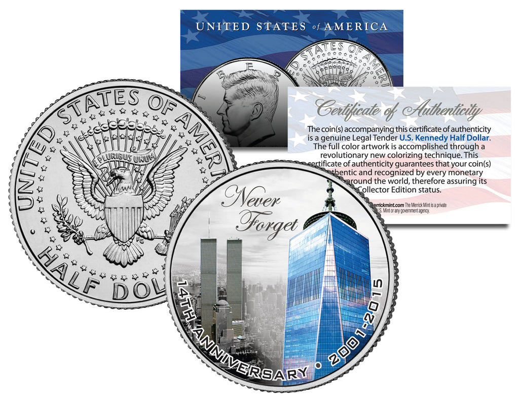 This is the WORLD TRADE CENTER – SEPTEMBER 11TH – 14TH ANNIVERSARY collectible coin. Here is your chance to own a beautifully colorized JFK Kennedy Half Dollar U.S. Coin. This high-quality genuine Legal Tender U.S. coin has been colorized using a unique painstaking multi-color authentic process by the Merrick Mint. Colorizing coins involves the unique application of special inks directly to the surface of a coin that achieves a level of detail, color saturation, and durability that is #1 in the coin industry. The result is an everlasting colorized coin collectible of ultra-high quality. Each coin comes in a premium coin capsule with a Certificate of Authenticity to guarantee that your coin is authentic and recognized by every monetary authority around the world, assuring its Collector Edition status.