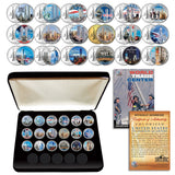 Here is your chance to own a complete set of eighteen (18) colorized 2001 New York Statehood Quarters U.S. Coins of the WORLD TRADE CENTER – SEPTEMBER 11TH ANNIVERSARIES. Each year for the last 18 years, a WTC 9/11 Anniversary coin was released by the Merrick Mint, marking that year’s September 11th Anniversary. This hard to find 18-coin set collects all 18 of these Anniversary coins. These high-quality, genuine Legal Tender United States coins have been colorized using a unique painstaking multicolor authentic process by the Merrick Mint. Colorizing coins involves the unique application of special inks directly to the surface of a coin that achieves a level of detail, color saturation, and durability that is #1 in the coin industry. The result is an everlasting colorized coin collectible of ultra-high quality. Each coin features an emblematic design of New York State on the reverse and colorized images of WORLD TRADE CENTER – SEPTEMBER 11TH on the obverse (portrait of George Washington design). Each coin comes in a premium coin capsule. The 18-coin set comes with a Certificate of Authenticity to guarantee that your coins are authentic and recognized by every monetary authority around the world, assuring its Collector Edition status.