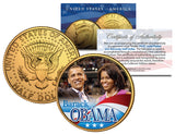 Here is your opportunity to own or gift the “BARACK & MICHELE OBAMA” colorized 2008 JFK Kennedy Half Dollar U.S. Coin, which has been layered in Genuine 24 Karat Gold, and then beautifully enhanced with colorized images by the Merrick Mint. This is the first-ever Barack & Michele Obama legal tender coin. Each coin comes in a premium coin capsule with a full color Certificate of Authenticity to guarantee that your coin is authentic and recognized by every monetary authority around the world, assuring its Collector Edition status. This Legal Tender United States coin has been colorized with an application of special inks directly to the surface of the coin, using a unique and painstakingly multicolor coin process, which achieves a level of detail, color saturation, and durability that is #1 in the coin industry. The result is an everlasting colorized coin collectible of ultra-high quality. The 2008 Kennedy half dollar is a U.S. fifty cent coin with mint marks chosen at random.