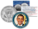 Here is your opportunity to own a beautifully colorized JFK Kennedy Half Dollar U.S. Coin featuring “BARACK OBAMA” in the “NOBEL PEACE PRIZE” coin series. Each coin comes in a premium coin capsule with a full color Certificate of Authenticity to guarantee that your coin is authentic and recognized by every monetary authority around the world, assuring its Collector Edition status. This Legal Tender United States coin has been colorized with an application of special inks directly to the surface of the coin, using a unique and painstakingly multicolor coin process, which achieves a level of detail, color saturation, and durability that is #1 in the coin industry. The result is an everlasting colorized coin collectible of ultra-high quality. The Kennedy half dollar is a U.S. fifty cent coin with coin year and mint marks chosen at random.