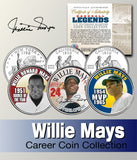 Here is your opportunity to own or to gift the WILLIE MAYS complete 3-coin set of colorized Statehood Quarters U.S. Coins, which have been enhanced with beautifully colorized images by the Merrick Mint. Each coin comes in a premium coin capsule. The complete 3-coin set comes with a full color Certificate of Authenticity. These Legal Tender United States coin have been colorized with an application of special inks directly to the surface of the coin, using a unique and painstakingly multicolor coin process, which achieves a level of detail, color saturation, and durability that is #1 in the coin industry. The result is an everlasting colorized coin collectible of ultra-high quality. Each Statehood Quarter coin features an emblematic design of the State on the reverse and colorized image of Willie Mays on the obverse (portrait of George Washington design).