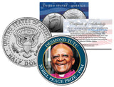 Here is your opportunity to own a beautifully colorized JFK Kennedy Half Dollar U.S. Coin featuring “DESMOND TUTU” in the “NOBEL PEACE PRIZE” coin series. Each coin comes in a premium coin capsule with a full color Certificate of Authenticity to guarantee that your coin is authentic and recognized by every monetary authority around the world, assuring its Collector Edition status. This Legal Tender United States coin has been colorized with an application of special inks directly to the surface of the coin, using a unique and painstakingly multicolor coin process, which achieves a level of detail, color saturation, and durability that is #1 in the coin industry. The result is an everlasting colorized coin collectible of ultra-high quality. The Kennedy half dollar is a U.S. fifty cent coin with coin year and mint marks chosen at random.