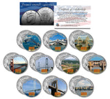 Here is your chance to own a complete set of ten (10) colorized JFK Kennedy Half Dollar U.S. Coins of FAMOUS BRIDGES OF THE WORLD. These high-quality, genuine Legal Tender United States coins have been colorized using a unique painstaking multicolor authentic process by the Merrick Mint. Colorizing coins involves the unique application of special inks directly to the surface of a coin that achieves a level of detail, color saturation, and durability that is #1 in the coin industry. The result is an everlasting colorized coin collectible of ultra-high quality. Each coin comes in a premium coin capsule. The 10-coin set comes with a Certificate of Authenticity to guarantee that your coins are authentic and recognized by every monetary authority around the world, assuring its Collector Edition status. The Kennedy half dollar is a U.S. fifty cent coin with coin year and mint marks chosen at random.